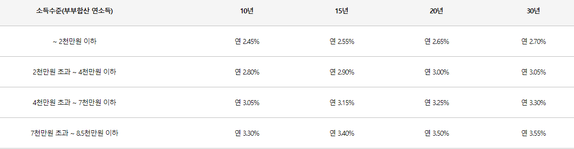 - 부부합산 연소득 6천만 원(생애최초구입자, 신혼가구, 2자녀 이상 가구는 연소득 7천만 원)이하