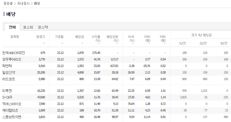 3. 이렇게 배당금 및 수익률 이 높은 순으로 공개가 되며, 어느 회사가 배당금이 높은지 간단하게 조회할 수 있습니다.