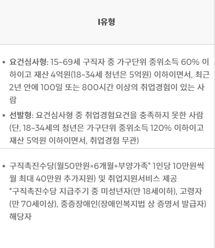 1유형은 재산이 4억원 이하이면서 기준 중위소득 60% 이하에 해당하셔야 가능하십니다. 여기에 더해 추가로 2년 동안 100일 이상 또는 800시간 이상의 취업경험이 있는 사람이여합니다.