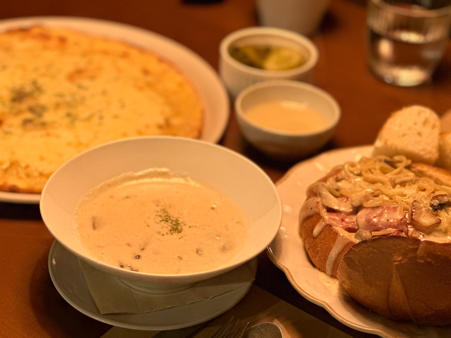 저희는 C 세트에서 크림 빠네 와 고르곤졸라 피자, 안심스테이크를 주문 했는데요