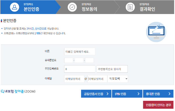 3. 이름, 휴대폰번호, 주민등록번호, 이메일 작성 후 인증을 해주시면 됩니다. 인증 방법은 공동인증서, IPIN, 휴대폰인증이 있습니다.