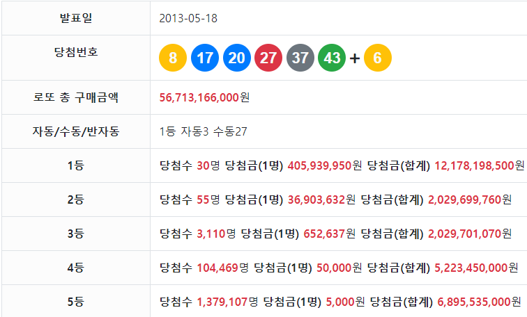 | 1위 (546회차) | 405,939,950 원 | 30명 | 8, 17, 20, 27, 37, 43 + 6 |