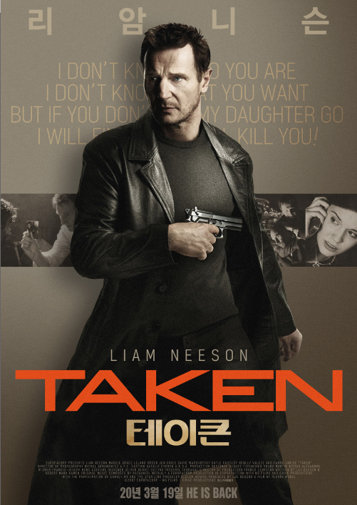 테이큰은 리암 니슨과 매기 그레이스가 출연한 작품인데요. 리암 니슨은 전직 특수요원으로 성매매범에게 납치된 딸을 구하기 위해 혈투를 벌이는 작품입니다.