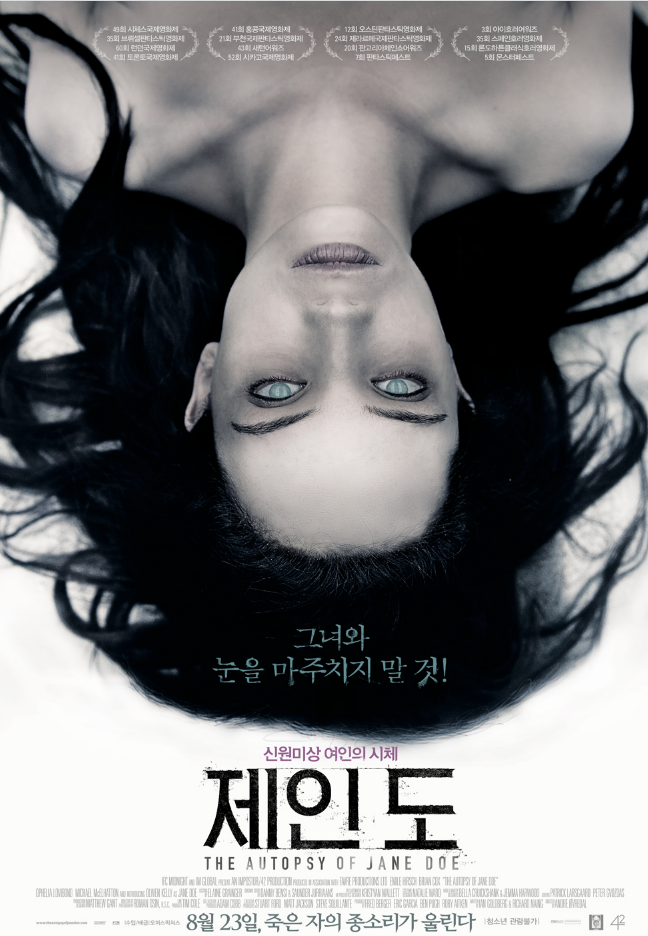 영화 <제인 도>의 뜻은 미국에서 일반적으로 신원 미상인 여성 변사체를 발견하면 jane goe라고 부르는데요.(신원 미상인 남자는 john doe 존도라고 부른다) 영화 내용은 한 일가족 살인 사건 현장 지하에서 신원 미상의 여성 시체를 발견한 보안관이 부검소로 시체를 가져와 검시관인 아버지와 아들이 팀을 이루어 시체를 부검을 할 때, 이상하고 초자연적인 일들이 일어나는 영화입니다. <제인 도>는 비평가로부터는 긍정적인 평가를 받았지만 주요 흥행작은 아니어서 전 세계적으로 680만 달러의 수익을 올렸으며 미국과 캐나다에서 만 280만 달러를 벌어들인 영화입니다.