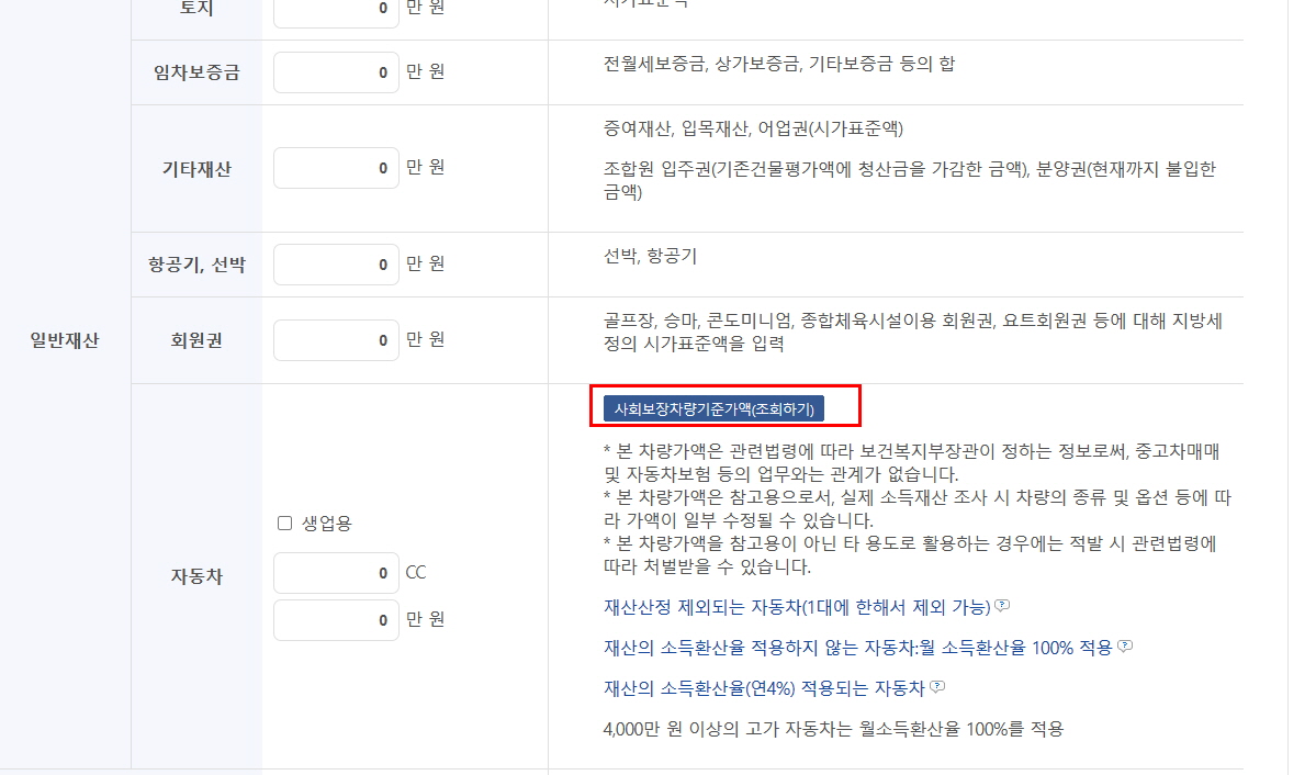 3. 밑으로 스크롤을 내려주시면 일반재산의 자동차가 보이는데 여기서 사회보장차량가액을 조회 버튼을 클릭