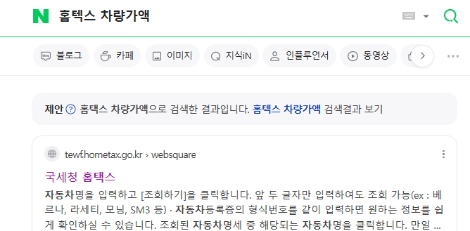 1. 검색창에 "홈택스 차량가액"을 검색하시면 홈택스 자동차 차량가액 조회로 바로 가실 수 있습니다.
