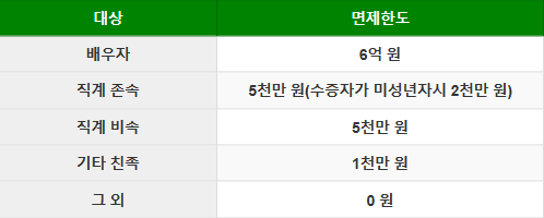 | 직계 존속 | 5천만 원 (대상자가 미성년자시 2천만 원) |
