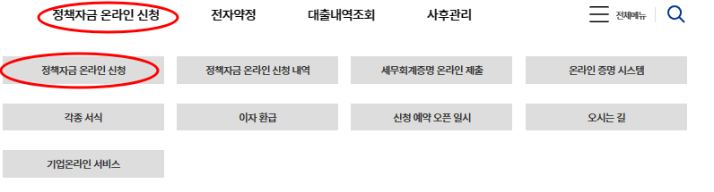 홈페이지 메인 메뉴 정책자금 온라인신청을 클릭 후 들어가셔야 합니다.