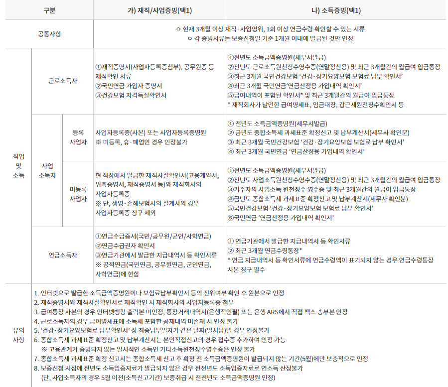 현재 3개월 이상 재직, 사업영위(또는 1회 이상 연금수령) 확인을 위해 재직, 사업증빙 및 소득증빙 서류 제출이 필요합니다.