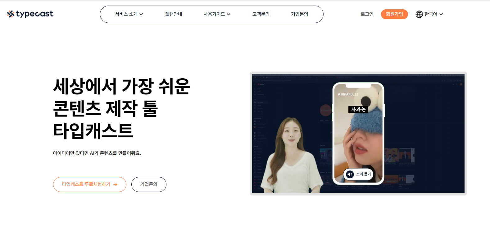 마지막을 소개해드릴 AI음성 사이트 및 어플은 바로 "타입캐스트"입니다. 타입캐스트는 네이버 클로바더빙 보다 조금 더 세밀하게 조정이 가능하며, 다양한 설정을 할 수 있다는 장점이 있습니다.