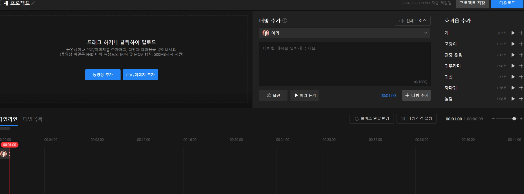 이곳에서 자신이 쓰고 싶은 대사를 적으신 후 원하는 시간과 분에 넣어 주시고 더빙 추가를 하시거나 혹은 효과음 버튼을 눌러 원하는 곳에 삽입해 주시면 됩니다. 간단하게 자신이 원하는 대사를 AI로 바로 할 수 있습니다.