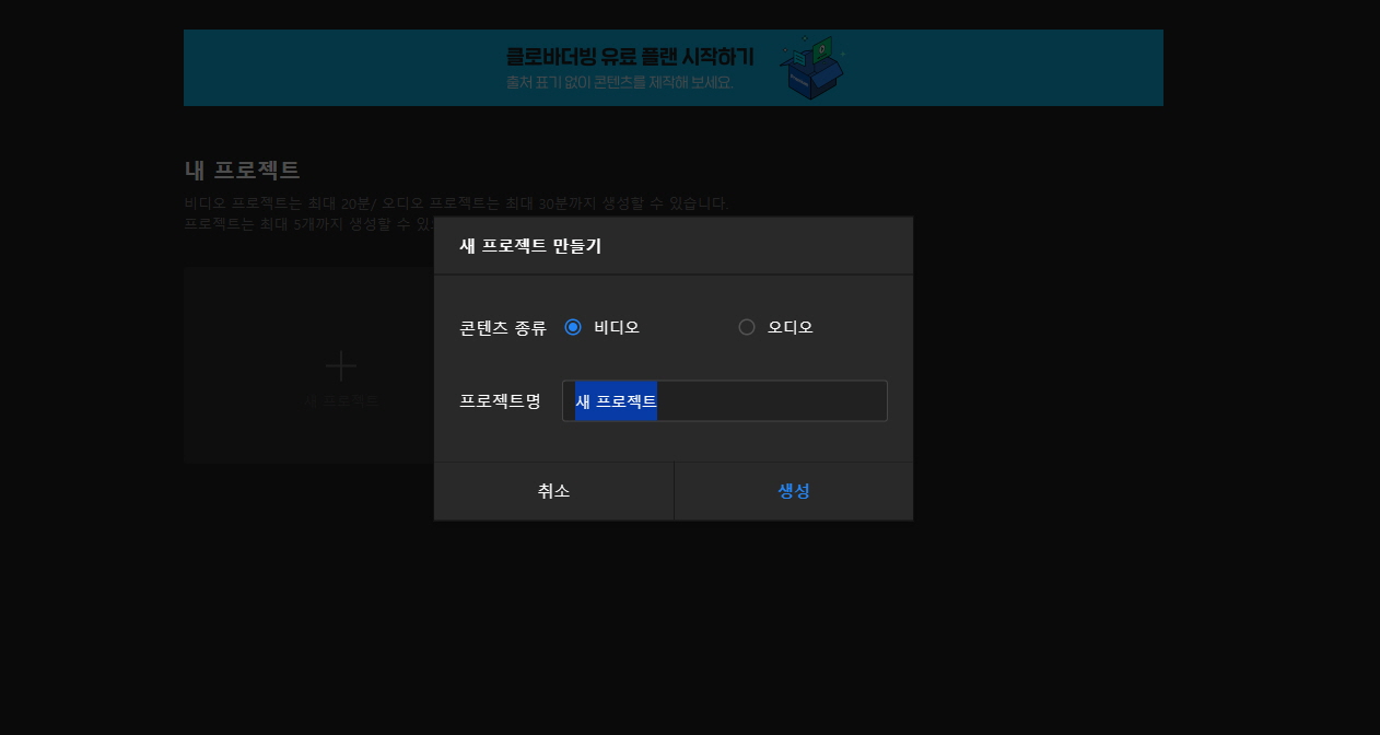 이 화면에서 새 프로젝트를 눌러 주시면, 오디오나 혹은 비디오 콘텐츠 종류를 선택해서 제목을 지어주시고 생성 버튼을 눌러주십니다.